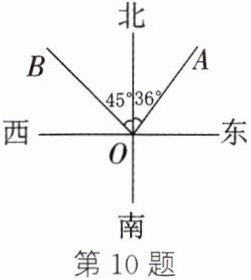 10. (1) 如图, $OA$ 是表示北偏东 $36^{\circ}$ 方向的一条射线,射线 $OB$ 表示______偏______ $45^{\circ}$ 方向(也称为西北方向)的一条射线;