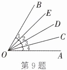 9. 如图,$∠1= ∠2= ∠3= ∠4$,则图中与$∠AOD$相等的角是______.若$∠AOB= 60^{\circ }$,则$∠1= $______$^{\circ },∠BOC= $______$^{\circ }$.