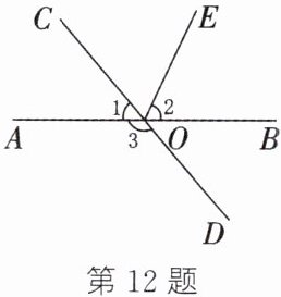 12. 如图,直线 AB,CD 相交于点 O,$∠2-∠1= 15^{\circ },∠3= 130^{\circ }$.