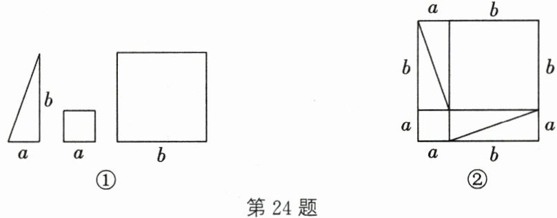 24. (8分)如图①所示为1个直角三角形和2个小正方形,直角三角形的两条直角边的长分别是$a,b$,2个小正方形的边长分别是$a,b(a < b)$.如图②,将4个完全一样的直角三角形和2个小正方形拼成一个大正方形.