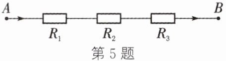 5. (新考向·跨学科)(2024·广州)如图,把$R_{1},R_{2},R_{3}$三个电阻(单位:Ω)串联起来,线路$AB上的电流为I$ A,电压为$U$ V,则$U= IR_{1}+IR_{2}+IR_{3}$,当$R_{1}= 20.3,R_{2}= 31.9,R_{3}= 47.8,I= 2.2$时,$U$的值为______.