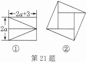 21. (新考法·综合与实践)如图①,将长为$2a+3$、宽为$2a$的长方形分割成四个完全一样的直角三角形,拼成包含大小两个正方形的图②.