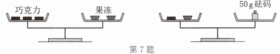 7. 如图所示的两台天平保持平衡.已知每块巧克力的质量相等,且每个果冻的质量也相等,则每个果冻的质量为 ()