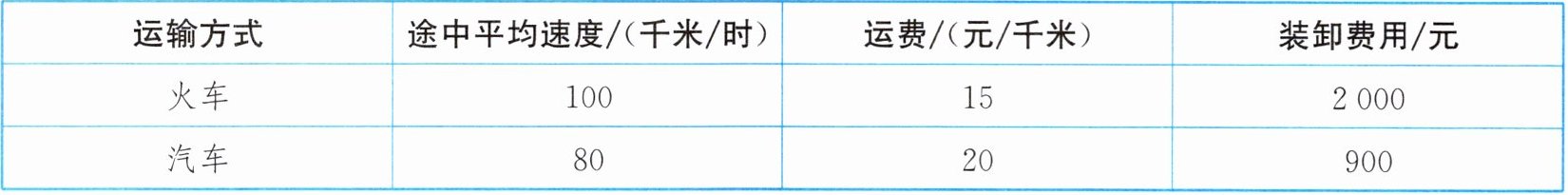 4. (新考法·探究题)B市水果批发部门欲将A市的一批水果运往本市销售,有火车和汽车两种运输方式,运输过程中的损耗均为200元/时.其他主要参考数据如下表: