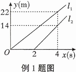 例1 (2025南开中学期末)小南和小凯进行百米赛跑,小南比小凯跑得快,若两人同时起跑,小南肯定赢.现在小南让小凯先跑若干秒,图中$l_{1},l_{2}$分别表示两人的路程和小凯出发的时间的关系.下列说法中错误的是 (