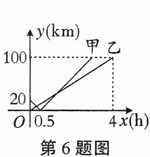 6. 一条公路沿线有A,B,C三个站点,甲、乙两车分别从A,B站点同时出发,匀速驶达C站.设甲、乙两车行驶xh后,与B站的距离分别为$y_{1}km,y_{2}km.y_{1},y_{2}$与x的函数关系如图,则两车相遇的时间是