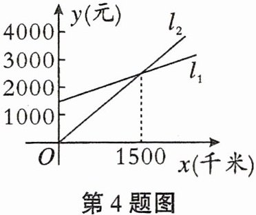 4. 某公司准备和A,B两家租车公司中的一家签订合同.设A,B两家租车公司收费y(元)与行程x(千米)的关系分别是$l_{1},l_{2}$,如图.若行程大于1500千米,则选择
