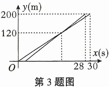 3. (2025重庆一中期末)在运动会200米比赛中,运动员甲因为起步摔跤,导致晚出发了几秒钟,甲、乙两人在比赛中的路程$y(m)与比赛时间x(s)$的关系如图所示,则下列说法错误的是 (