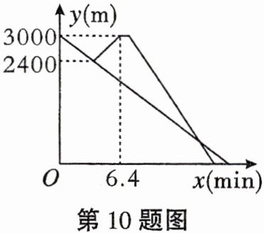 10. 小亮家、小刚家、体育馆顺次在同一条直线上,周末小亮从家匀速步行去体育馆打羽毛球.小亮出发4min经过小刚家时,小刚跟随小亮一起前往体育馆,两人走了4min后,小刚发现自己忘记带装备,于是小刚加速返回家,取了装备后(取装备用了一段时间)又以返回家时的速度赶往体育馆;小亮仍以原速度前行,结果小刚比小亮提前1min到达体育馆.若小亮与小刚两人和体育馆之间的距离$y(m)与小刚出发的时间x(min)$之间的函数图象如图所示,则以下说法正确的是______