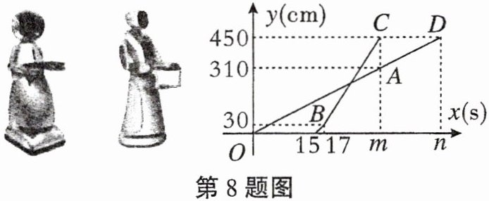 8. (2025九龙坡区期末)随着人工智能的发展,智能机器人送餐成为时尚.如图所示是某餐厅的机器人聪聪和慧慧,他们从厨房门口出发,准备给距离450cm的客人送餐,聪聪比慧慧先出发,且速度保持不变,慧慧出发一段时间后将速度提高到原来的2倍.设聪聪行走的时间为$x(s)$,聪聪和慧慧行走的路程分别为$y_{1}(cm),y_{2}(cm),y_{1},y_{2}$与x之间的函数图象如图所示,则下列说法不正确的是 (