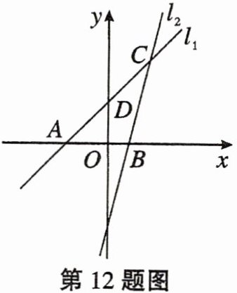 12. 如图,在平面直角坐标系中,直线$l_1:y = x + 2$与x轴交于点A,与y轴交于点D,直线$l_2$与x轴交于点$B(1,0)$,与$l_1相交于点C(m,4)$.