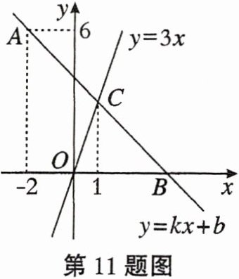 11. 如图,在平面直角坐标系中,一次函数$y = kx + b的图象经过点A(-2,6)$,且与x轴相交于点B,与正比例函数$y = 3x$的图象相交于点C,点C的横坐标为1.