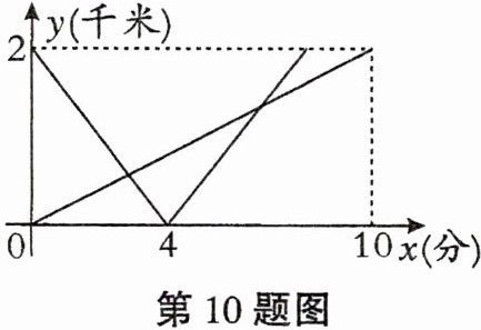 10. 甲、乙两地相距2千米,小明从甲地匀速跑步到乙地,小华同时出发沿同一条公路从乙地骑自行车匀速到达甲地后,立刻以原速度返回乙地. 小明、小华到甲地的距离$y$(千米)与出发的时间$x$(分)的函数图象如图所示,则小明出发