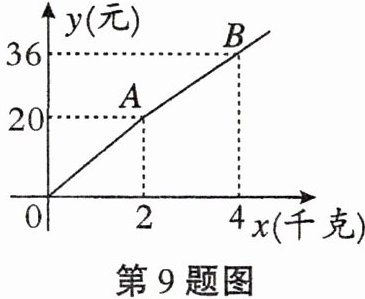 9. 如图,购买一种苹果所付款金额$y$(元)与购买量$x$(千克)之间的函数图象由线段$OA和射线AB$组成. 若一次购买5千克这种苹果所付金额为$y_{1}$(元),购买五次1千克所付金额为$y_{2}$(元),则$y_{2}-y_{1}= $______