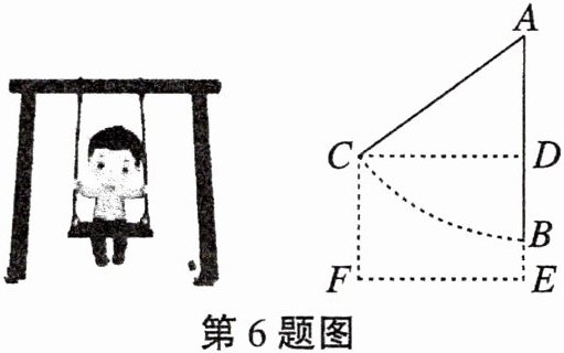 6. 如图,当秋千静止时,踏板离地面的垂直高度BE= 1m,将它往前推4m至点C处时(即水平距离CD= 4m)。踏板离地面的垂直高度CF= 3m,它的绳索始终拉直,则绳索AC的长是______