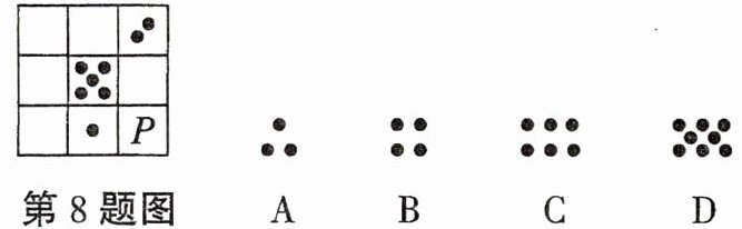 8. 我国古代的“河图”是由3×3的方格构成的,每个方格内均有数目不同的点图,每一行、每一列以及每一条对角线上的三个点图的点数之和均相等.如图所示,给出了“河图”的部分点图,则P处所对应的点图是 (