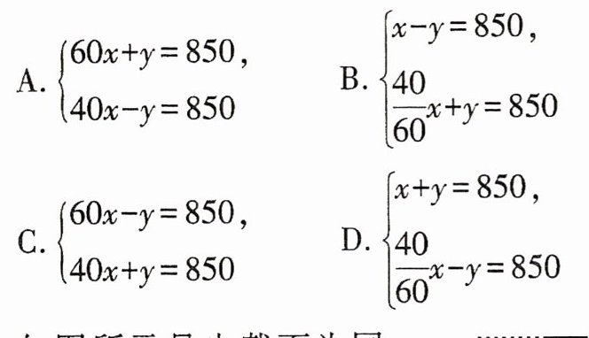 3. 已知某桥长850米,一列火车从桥上通过,测得火车开始上桥到完全过桥共用1分钟,整列火车在桥上的时间为40秒。设火车的速度为x米/秒,车长为y米,则下列方程组正确的是(