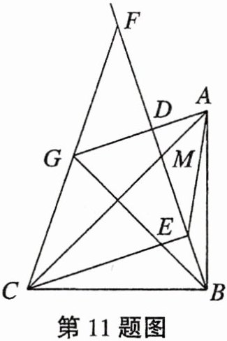 11. (2025重庆八中期末)如图,在△ABC中,∠ABC= 90°,AB= CB= 8,射线BF交线段AC于点M,AD⊥BF于点D,CE⊥BF于点E,BG平分∠ABC交AD的延长线于点G,连接CG并延长交BD的延长线于点F。若将点F沿AD翻折,点F刚好落在点E处,此时CF:DF= 5:2,连接AE,AC。求△AEC的面积为
