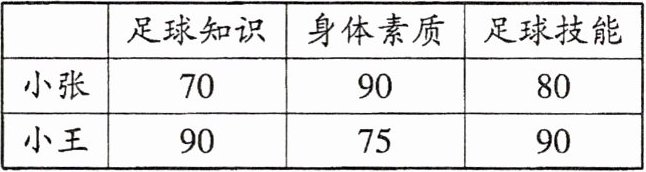 (2)根据实际情况,学校决定足球知识、身体素质、足球技能三项成绩按1:4:5的权重来确定最终评价成绩. 请你通过计算,说明小张、小王谁将获胜.