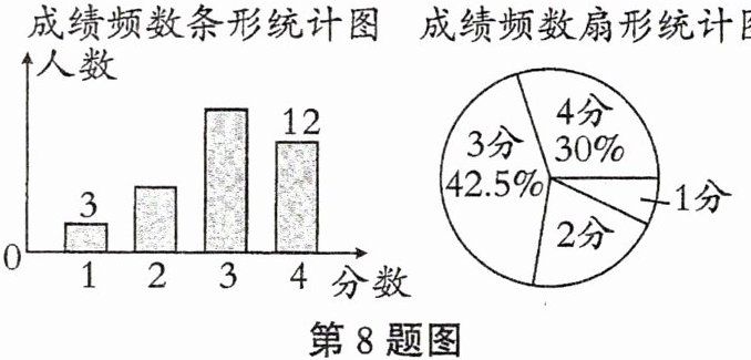 8. 某校体育组从八年级学生中随机抽取若干名学生进行体能测试,成绩记为1分,2分,3分,4分四个等级,将测试结果绘制成如图所示的条形统计图和扇形统计图. 根据图中信息,这些学生的平均分数是