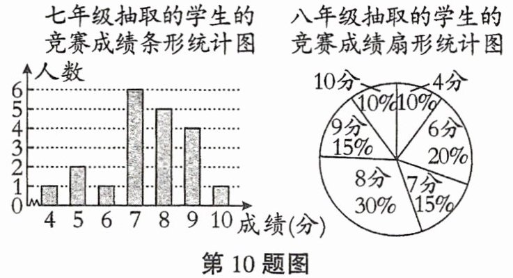 10. 某中学在全校七、八年级共640名学生中开展法律知识竞赛,并从七、八年级学生中各随机抽取20名学生,统计这部分学生的竞赛成绩(竞赛成绩均为整数,满分10分,6分及以上为合格),相关数据统计、整理如下: