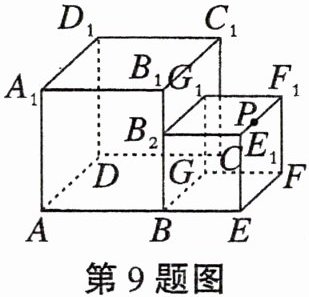 9. 棱长分别为9,6的两个正方体按如图所示放置,点P在E₁F₁上,且E₁P= $\frac{1}{3}$E₁F₁。若一只蚂蚁要沿着正方体的表面从点A爬到点P,则需要爬行的最短路程是