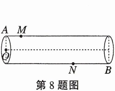 8. 如图,在学校工地的一根空心钢管外表面距离左侧管口2cm的点M处有一只小蜘蛛(即AM= 2cm),它要爬行到钢管内表面距离右侧管口5cm的点N处觅食(BN= 5cm),已知钢管横截面的周长为18cm,长为15cm,则小蜘蛛需要爬行的最短距离是(空心钢管壁厚度忽略不计)(