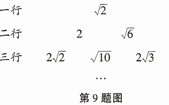 9. (2024德阳)将一组数$\sqrt {2},2,\sqrt {6},2\sqrt {2},\sqrt {10},2\sqrt {3},...,\sqrt {2n},...$,按如图所示的方式进行排列;则第八行左起第1个数是 (