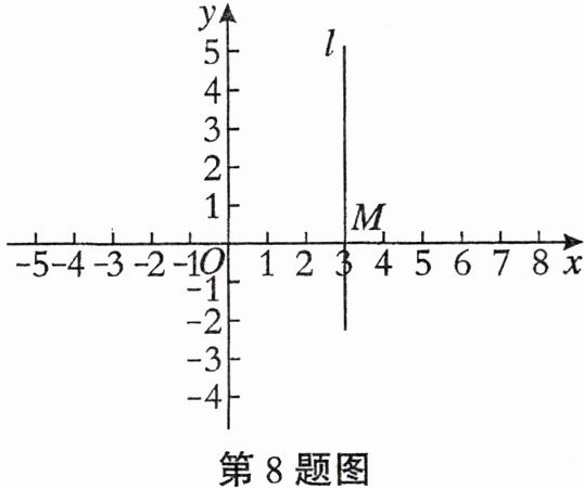 8. 如图,在平面直角坐标系中,直线$l经过点M(3,0)$,且平行于$y$轴,给出如下定义:点$P(x,y)先关于y轴对称得点P_{1}$,再将点$P_{1}关于直线l对称得点P'$,则称点$P'是点P关于y轴和直线l$的二次反射点.