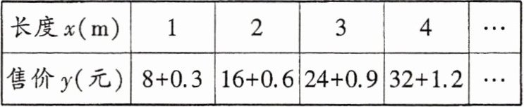 8. 百货大楼进了一批花布,出售时要在进价(进货价格)的基础上加一定的利润,其长度$x与售价y$如下表.下列用长度$x表示售价y$的关系式中正确的是 (