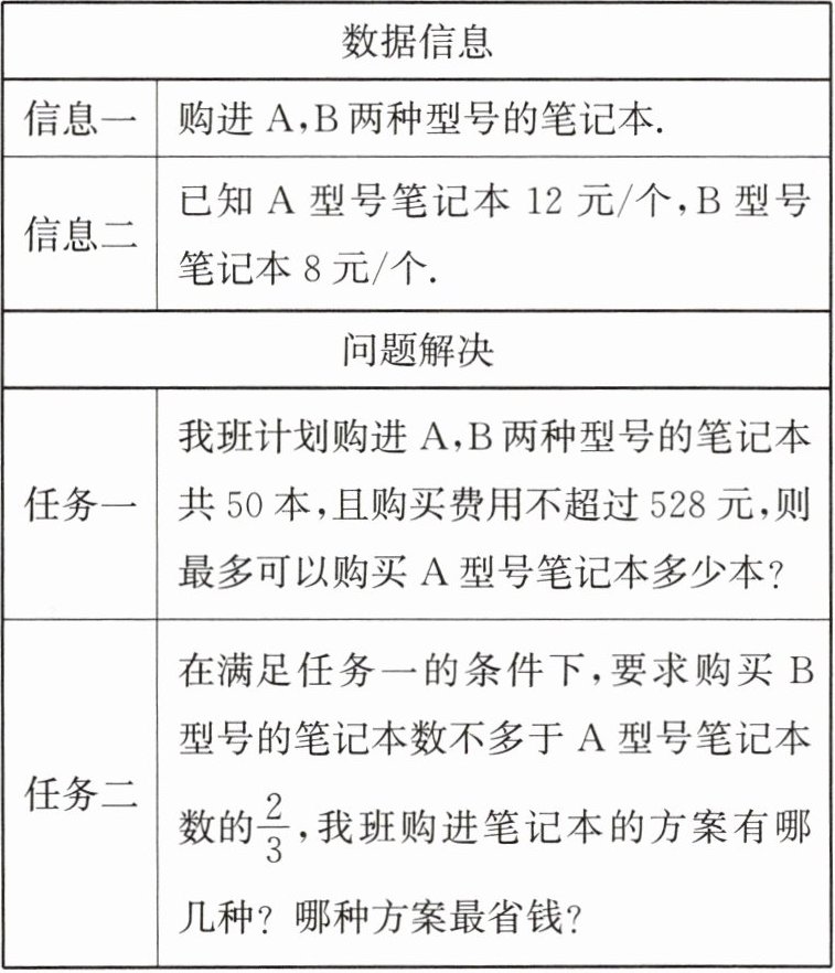 解:任务一:设可以购买 A 型号笔记本 x 本,则可以购买 B 型号笔记本 $(50 - x)$ 本,