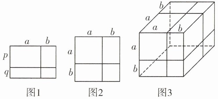 (2)类似的,通过不同的方法表示同一个长方体的体积,也可以探求相应的“因式分解等式”. 如图3,棱长为$a + b的正方体被分割成8$块. 则有____$=(a + b)^{3}$;