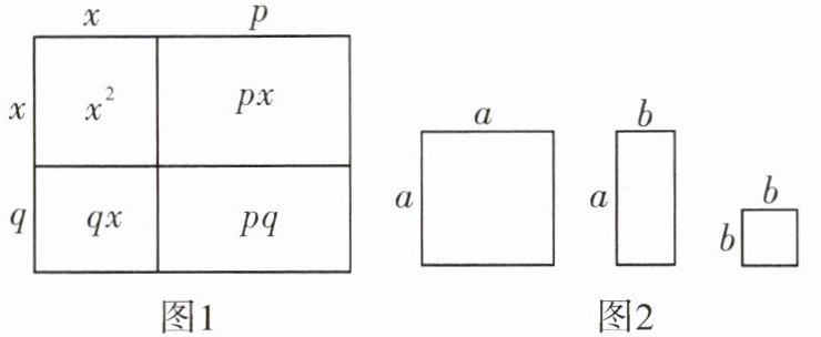 4. 将几个图形拼成一个新图形,再通过两种不同的方法计算同一个图形的面积,可以得到一个等式,例如,由图1可得等式$x^{2}+(p + q)x+pq= (x + p)(x + q)$. 将若干张图2所示的卡片进行拼图,可以将二次三项式$a^{2}+3ab + 2b^{2}$分解因式为 ()