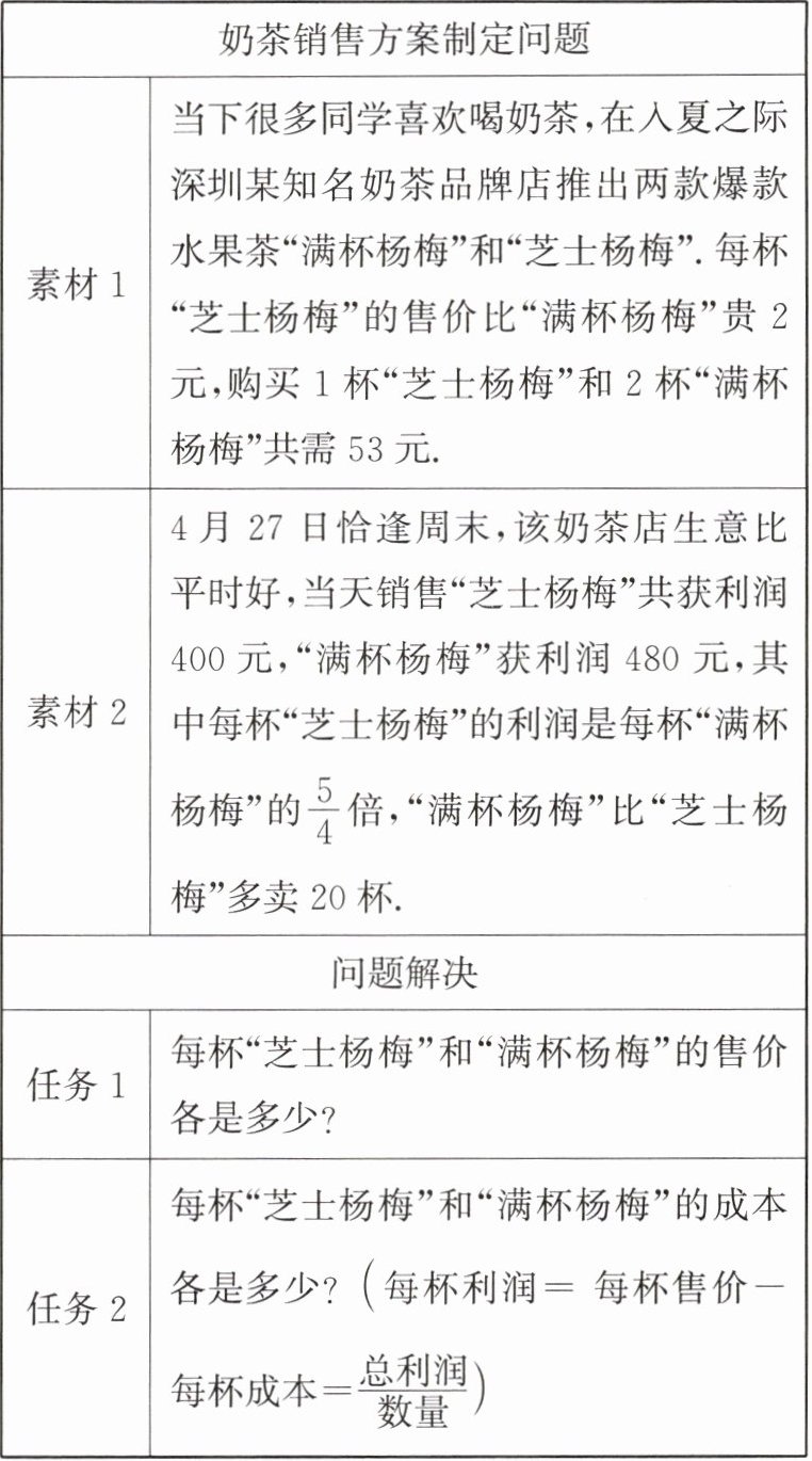 素材 1:当下很多同学喜欢喝奶茶,在入夏之际深圳某知名奶茶品牌店推出两款爆款水果茶“满杯杨梅”和“芝士杨梅”. 每杯“芝士杨梅”的售价比“满杯杨梅”贵 2 元,购买 1 杯“芝士杨梅”和 2 杯“满杯杨梅”共需 53 元.