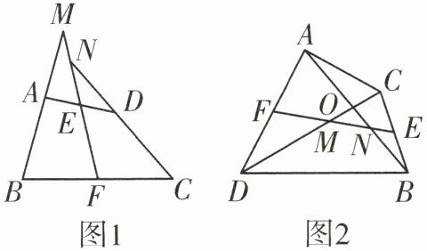 (2)如图$2$,在四边形$ADBC$中,$AB与CD相交于点O$,$AB= CD$,$E$,$F分别是BC$,$AD$中点,连接$EF$,分别交$DC$,$AB于点M$,$N$,判断$△OMN$的形状.