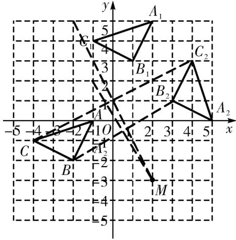 则$\triangle ABC$绕点$M$顺时针旋转$90^{\circ}$后得到$\triangle A_{2}B_{2}C_{2}$,由图可得旋转中心$M$的坐标为$(2,-3)$.