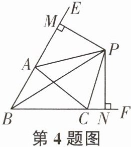 4. 如图,在$\triangle ABC$中,$\angle ABC$,$\angle EAC的平分线BP$,$AP交于点P$,延长$BA$,$BC$,$PM\perp BE$,$PN\perp BF$,则下列结论中正确的有()