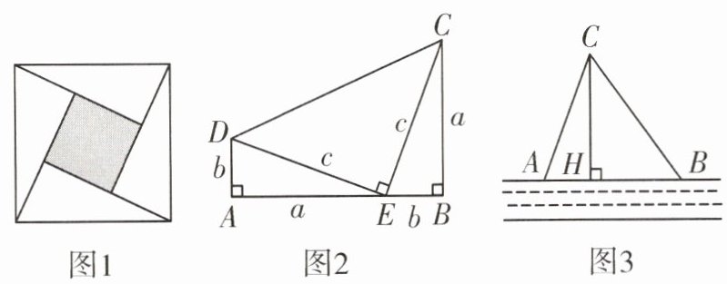 (2)如图3,在一条东西走向河流的一侧有一村庄$C$,河边原有两个取水点$A,B$,其中$AB = AC$,由于某种原因,由$C$到$A$的路现在已经不通,该村为方便村民取水决定在河边新建一个取水点$H$($A,H,B$在同一条直线上),并新修一条路$CH$,且$CH⊥AB$。测得$CH = 2.4km,HB = 1.8km$,求新路$CH$比原路$CA$少多少千米?