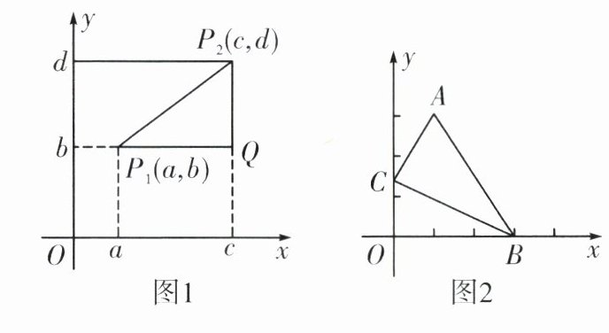 20. 小亮在网上搜索到下面的文字材料:在$x$轴上有两个点它们的坐标分别为$(a,0)$和$(c,0)$。则这两个点所成的线段的长为$|a - c|$;同样,若在$y$轴上的两点坐标分别为$(0,b)$和$(0,d)$,则这两个点所成的线段的长为$|b - d|$。如图1,在直角坐标系中的任意两点$P_1$,$P_2$,其坐标分别为$(a,b)$和$(c,d)$,分别过这两个点作两坐标轴的平行线,构成一个直角三角形,其中直角边$P_1Q = |a - c|$,$P_2Q = |b - d|$,利用勾股定理可得:线段$P_1P_2$的长为$\sqrt{(a - c)^2 + (b - d)^2}$。