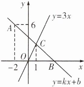 4. 如图,在平面直角坐标系中,一次函数$y=kx+b$的图象经过点$A(-2,6)$,且与$x$轴相交于点$B$,与正比例函数$y=3x$的图象相交于点$C$,点$C$的横坐标为1。
