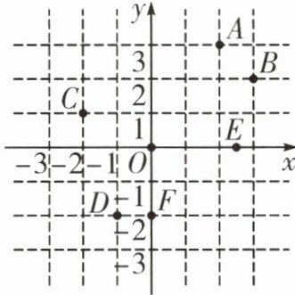 解:观察图形,由网格可得各点的坐标分别为$A(2,3)$,$B(3,2)$,$C(-2,1)$,$D(-1,-2)$,$E(2.5,0)$,$F(0,-2)$,$O(0,0)$。