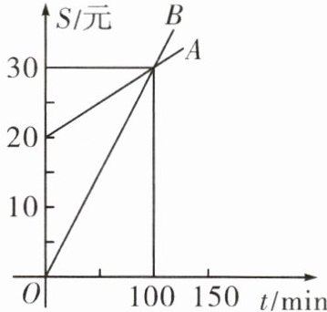 A. 某电信公司推出两种不同的收费标准:A种方式是月租20元;B种方式是月租0元。一个月本地网内打出电话费S(元)与打出时间t(min)的函数图象如图所示,当打出150min时,这两种方式的电话费相差 (