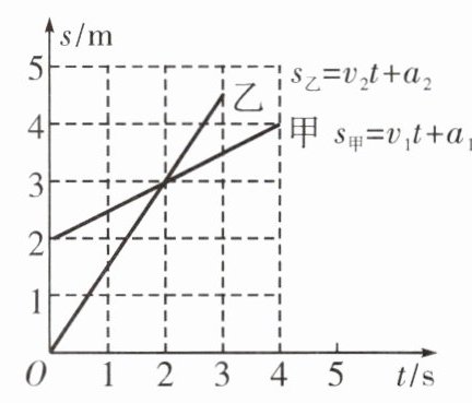1. 甲、乙两物体沿同一条直线同时、同向匀速运动,它们所经过的路程s与所需时间t之间的解析式分别为s甲$= v_1t+a_1$和s乙$= v_2t+a_2,$图象如图所示。有下列说法:①开始时,甲在乙的前面;②乙的运动速度比甲的运动速度快;③2s以后甲在前面;④2s时,甲、乙两物体都运动了3m。其中正确的说法是 (