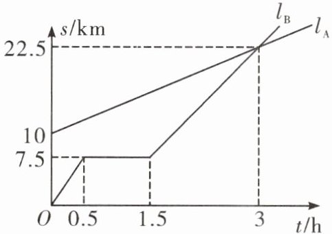 (5)设A行走的路程s与时间t的函数关系式为s = kt + b,则有$\begin{cases}b = 10,\\3k + b = 22.5,\end{cases}$解得$\begin{cases}k = \frac{25}{6},\\b = 10,\end{cases}$