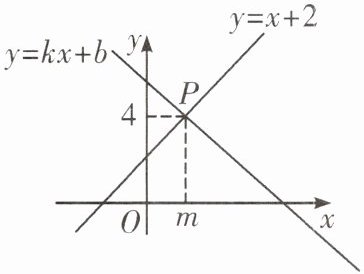 9. 如图,一次函数$y= kx+b与y= x+2的图象相交于点P(m,4)$,则方程组$\begin{cases}y= x+2,\\y= kx+b\end{cases}$的解是
