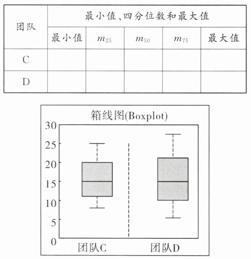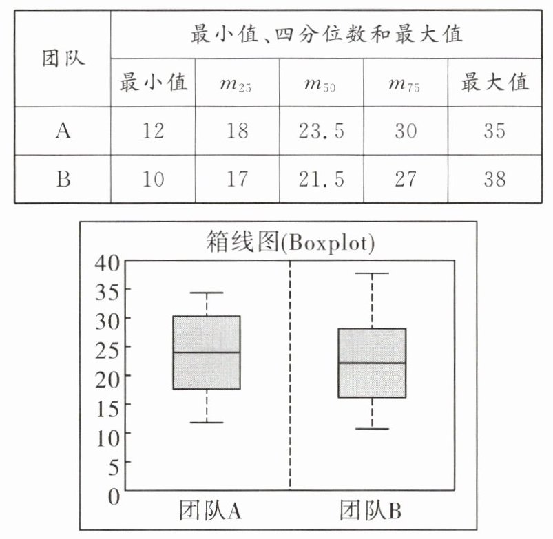 ·团队B:平均数为22.4,方差约为62.84,中位数为21.5,众数为20,下四分位数为17,上四分位数为27。