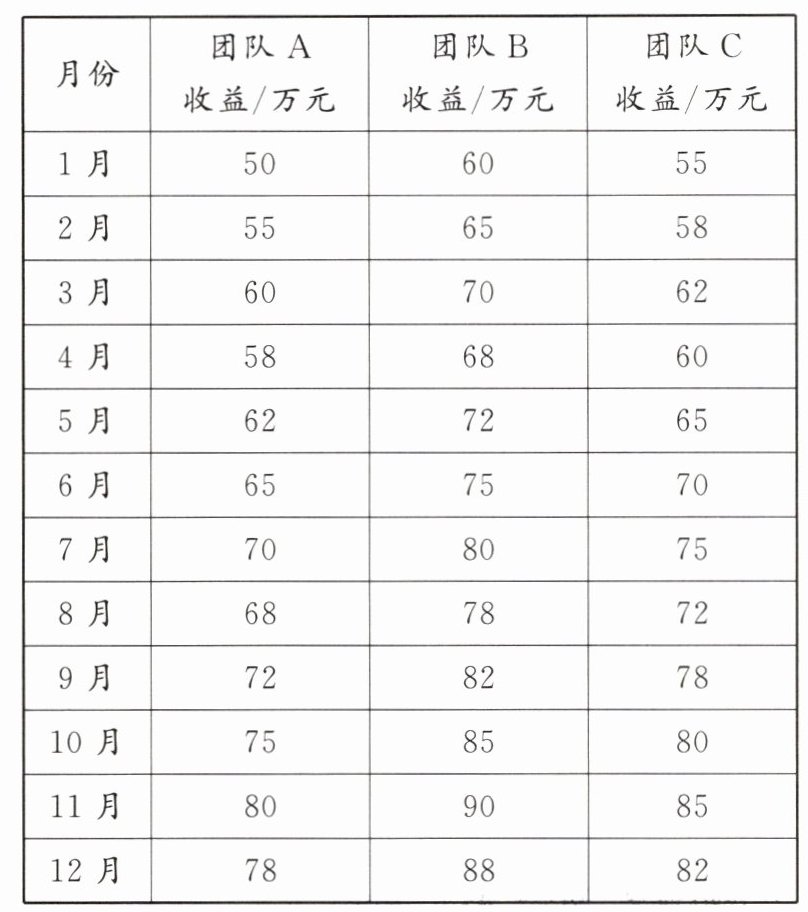 背景:某公司有三个销售团队(A,B,C),记录了每个团队在过去一年的月度收益数据。公司希望通过平均数、方差、四分位数和箱线图分析哪个团队的收益更高且更稳定。