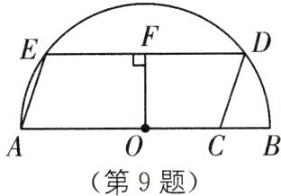 9. 如图,线段$AB = 10$,$AC = 8$,点$D$,$E在以AB为直径的半圆O$上,且四边形$ACDE$是平行四边形,过点$O作OF\perp DE于点F$,求$AE$的长。