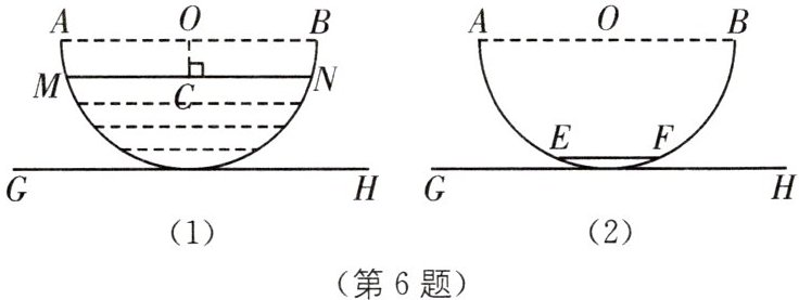 6. (2025·安徽淮北期末)如图(1),装有水的水槽放置在水平桌面上,其横截面是以$AB为直径的半圆O$,$AB = 26cm$,$MN$为水面截线,$MN = 24cm$,$GH$为桌面截线,$MN// GH$。