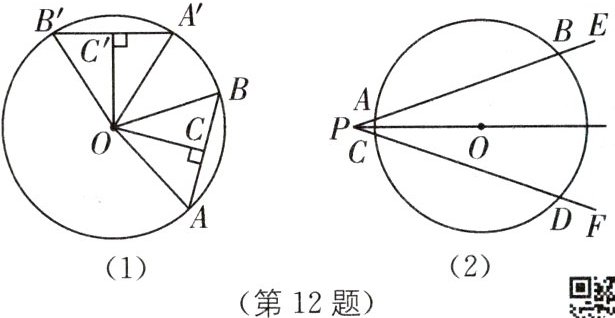12. 我们学习了“弧、弦、圆心角的关系”,实际上我们还可以得到“圆心角、弧、弦、弦心距之间的关系”如下:在同圆或等圆中,如果两个圆心角、两条弧、两条弦或两条弦的弦心距中有一组量相等,那么它们对应的其余各组量也相等(弦心距指从圆心到弦的距离,如图(1)中的$OC,OC'$,弦心距也可以说成圆心到弦的垂线段的长度). 请解答下列问题.